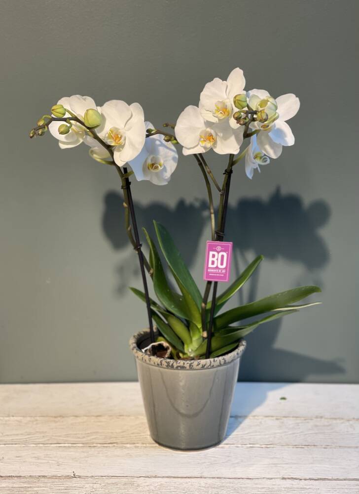 Flott orkide med passende potte og pynt.