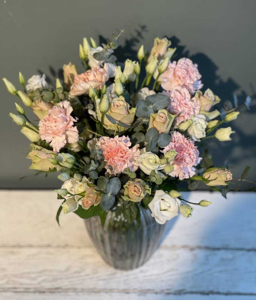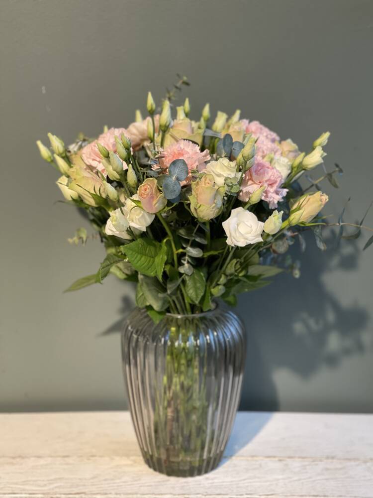 Nydelig sommerbukett i rosatoner. Her bruker vi sesongens blomster i rosatoner .Fin gavebukett. Ønsker du å sende med sjokolade og/ eller eple cider finner du det under kategorien tilbehør.